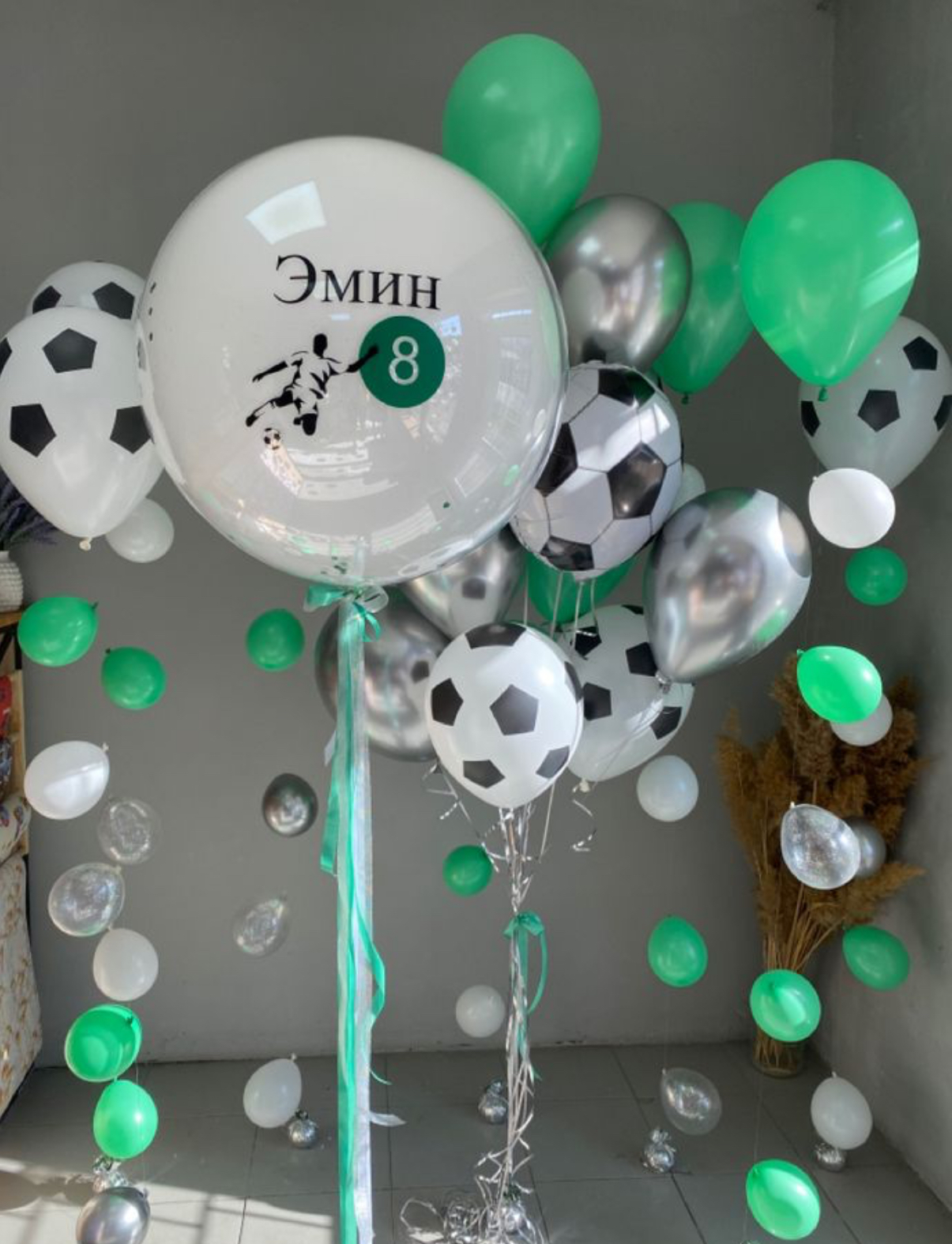 - 1 фонтан из (4 салатовых пастель, 3 хром серебро,3 футбольных шара, 1 фольгированный круг шар);